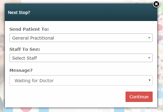 Click on the blue menu item to popup the waiting list. The list displays the information of patients that have been assigned for consultation. From the waiting list, you can select a patient and reassign them to the next point of call.